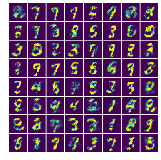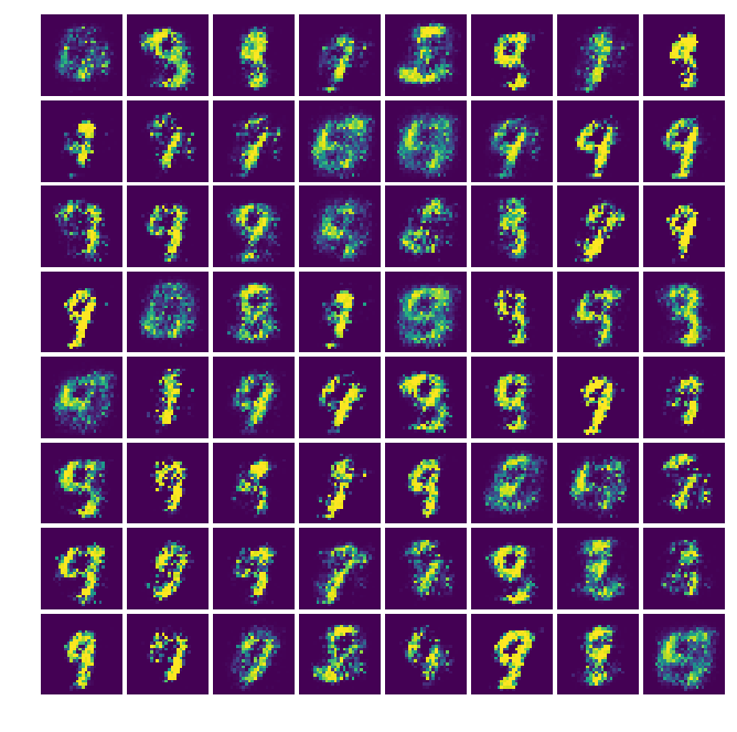 # -*- coding: utf-8 -*- """ GAN(Generative Adversarial Networks)을 이용한 MNIST 데이터 생성 Reference : https://github.com/TengdaHan/GAN-TensorFlow Author : solaris33 Project URL : http://solarisailab.com/archives/2482 """ import tensorflow as tf import numpy as np import matplotlib.pyplot as plt import matplotlib.gridspec as gridspec import os # MNIST 데이터를 불러옵니다. from tensorflow.examples.tutorials.mnist import input_data mnist = input_data.read_data_sets("./mnist/data/", one_hot=True) 예제를 보면 학습과 동시에 학습 정도에 따른 결과물을 확인할 수 있도록 코드가 짜여져 있다.