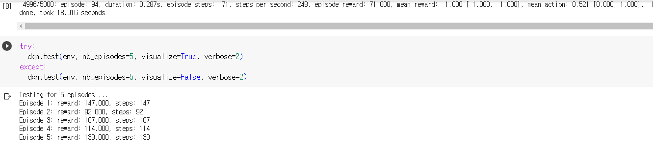 !pip install keras-rl2아래와 같이 구글 colab 환경에서 테스트 수행