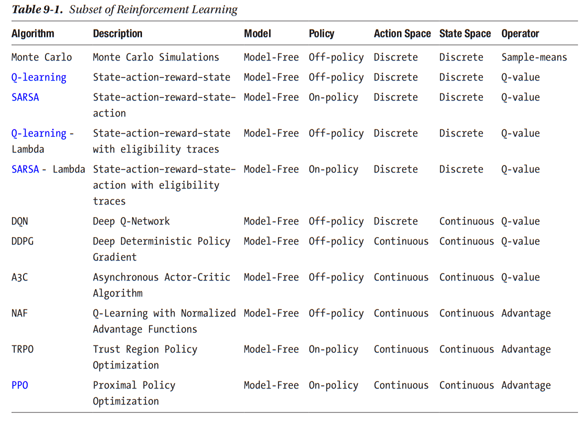 직관적인 이해가 쉬운 DQN외에도 아래의 표와 같은 여러 알고리즘들이 있다.