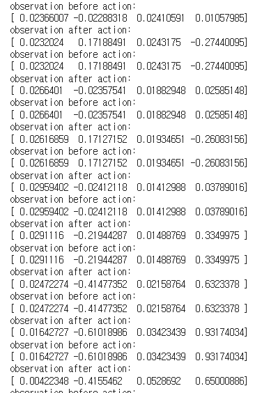 /usr/local/lib/python3.10/dist-packages/gym/envs/registration.py:593: UserWarning: WARN: The environment CartPole-v0 is out of date. You should consider upgrading to version `v1`. logger.warn( /usr/local/lib/python3.10/dist-packages/gym/core.py:317: DeprecationWarning: WARN: Initializing wrapper in old step API which returns one bool instead of two. It is recommended to set `new_step_api=True` to use new step API. This will be the default behaviour in future. deprecation( /usr/local/lib/python3.10/dist-packages/gym/wrappers/step_api_compatibility.py:39: DeprecationWarning: WARN: Initializing environment in old step API which returns one bool instead of two. It is recommended to set `new_step_api=True` to use new step API. This will be the default behaviour in future. deprecation( /usr/local/lib/python3.10/dist-packages/gym/core.py:49: DeprecationWarning: WARN: You are calling render method, but you didn't specified the argument render_mode at environment initialization. To maintain backward compatibility, the environment will render in human mode. If you want to render in human mode, initialize the environment in this way: gym.make('EnvName', render_mode='human') and don't call the render method. See here for more information: https://www.gymlibrary.ml/content/api/ deprecation( --------------------------------------------------------------------------- error Traceback (most recent call last) <ipython-input-1-13693d494ab9> in <cell line: 4>() 6 observation = env.reset() 7 for t in range(100): ----> 8 env.render() 9 # 행동(action)을 취하기 이전에 환경에 대해 얻은 관찰값(observation) 10 print('observation before action:') 11 frames /usr/local/lib/python3.10/dist-packages/gym/envs/classic_control/cartpole.py in _render(self, mode) 230 pygame.init() 231 if mode == "human": --> 232 pygame.display.init() 233 self.screen = pygame.display.set_mode( 234 (self.screen_width, self.screen_height) error: No available video device이때, 환경변수와 gygame 모듈을 사용하여 게임 환경 상에서 구동이 가능하게 설정을 하면 해결이 가능하다.
