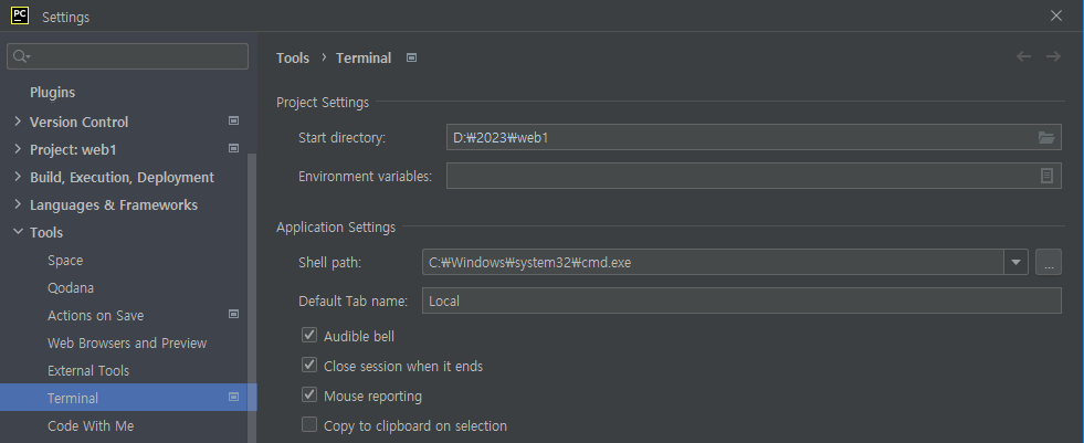 아래 이미지처럼 shell path 를 cmd로 설정 후, 프로그램을 재시작 해야 한다.