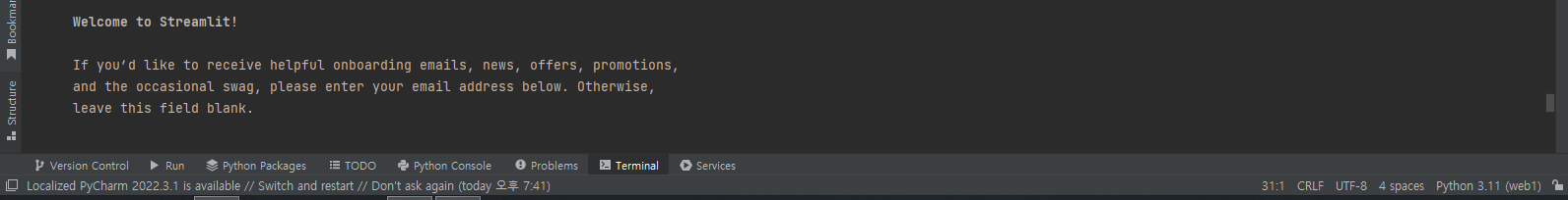 pip install streamlit1. pycharm 환경에서 개발을 하였는데 초반에 문제가 조금 발생하여 몇 가지 방법을 통해 해결했다.