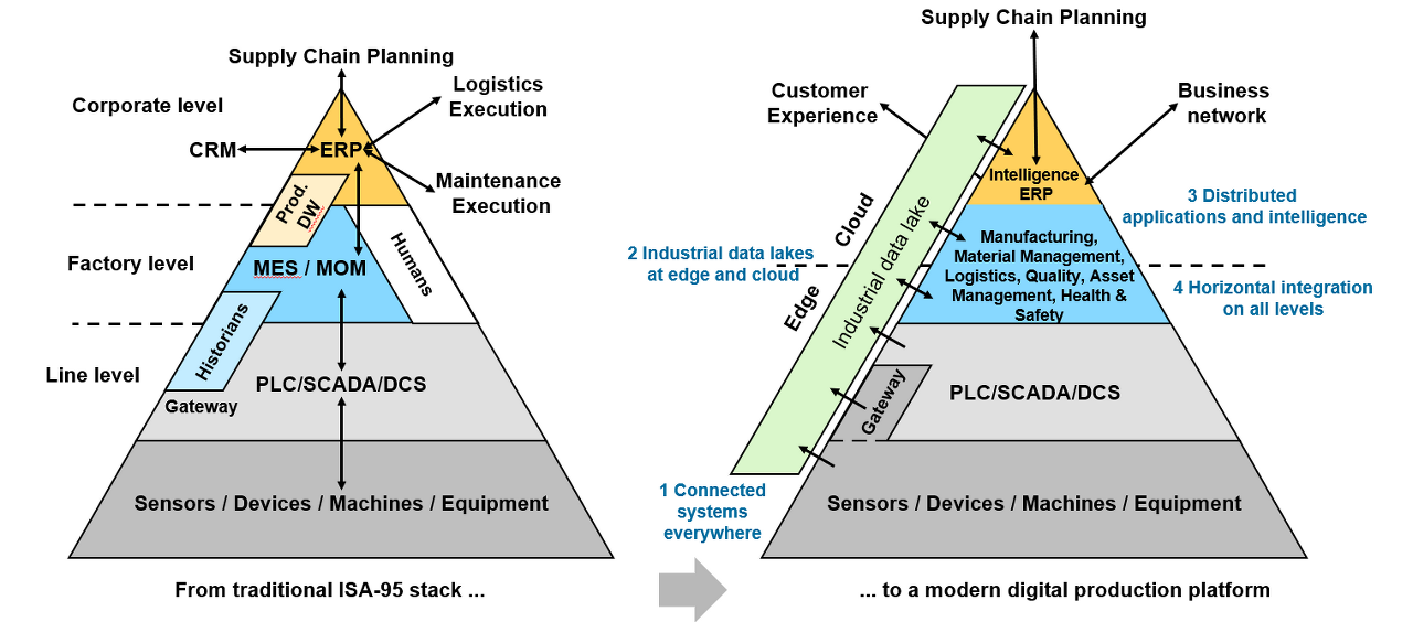 ISA-95 는 Enterprise-Control System Integration (ECSI) model이라고 알려진 계층모델을 정의한다.(enterprise level (Level 4) to the control devices on the factory floor (Level 0).)
