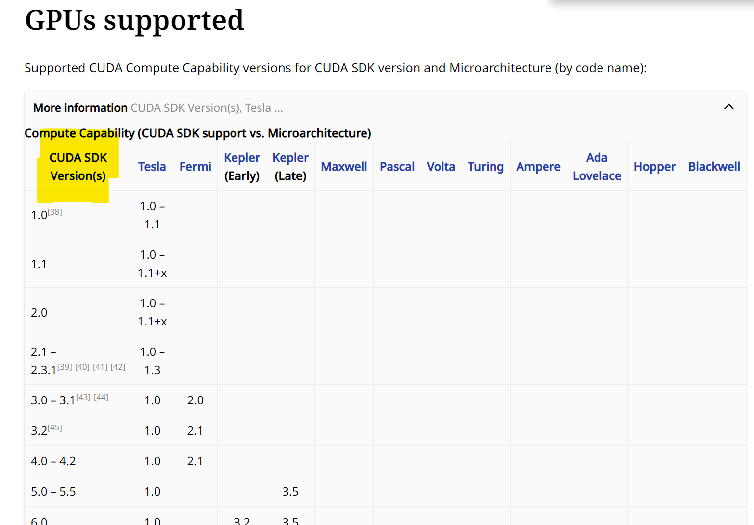 Compute Capability (CUDA SDK support vs. Microarchitecture)CUDA SDKVersion 보기